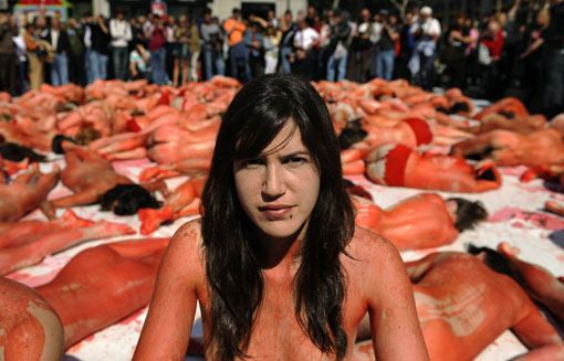 3月15日,西班牙马德里,动物保护协会成员身涂人造血,抗议捕猎海豹。