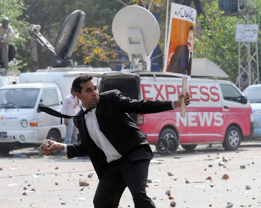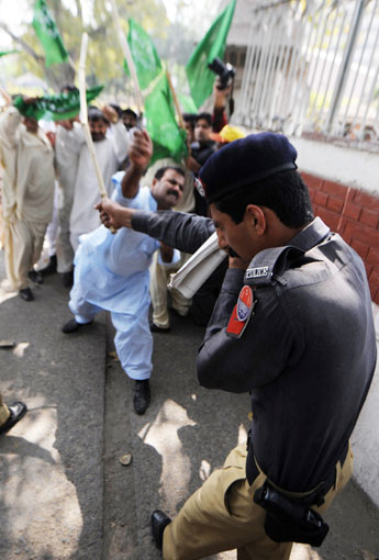 3月15日,巴基斯坦前总理谢里夫的支持者在拉合尔举行抗议集会时与警察发生冲突。