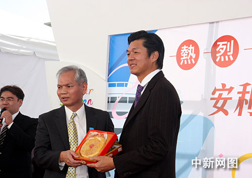图为台湾海峡两岸观光旅游协会秘书长吴朝彦向安利大中华区行政总裁颜志荣致赠台北县新庄百年老店的传统喜饼。