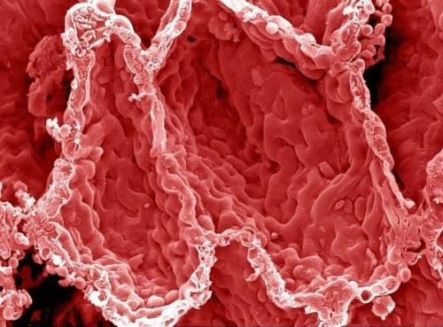 肺气泡:这张彩色图片显示的是人类肺部内表面。图中的洞穴是肺气泡,这里是血液交换气体的地方。