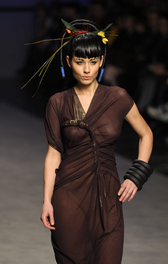 3月16日,模特在乌克兰首都基辅举行的时装周上展示造型奇丽的发型设计。