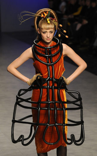3月16日,模特在乌克兰首都基辅举行的时装周上展示造型奇丽的发型设计。
