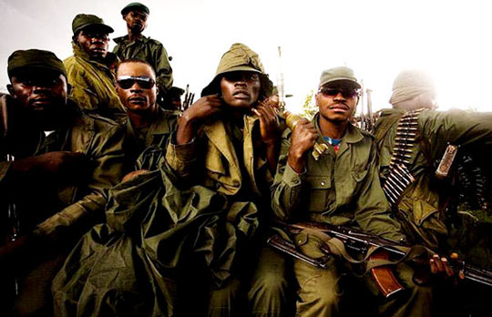 一群刚果士兵:一群刚果士兵在驱逐叛军后坐在一辆吉普车上。(新闻照片和记录片-当代事件一等奖)
