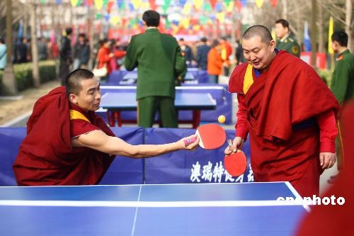 图:北京雍和宫喇嘛挥拍打乒乓——中新网