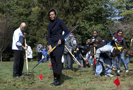 中新网3月21日电 当地时间3月20日,美国“第一夫人”米歇尔·奥巴马带领一群小学生在白宫的南草坪进行将草地改造菜园计划。这里种植出的食物将供“第一厨房”和华盛顿其他厨房使用。