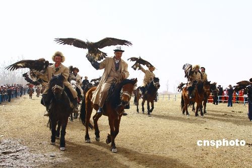 3月20日,新疆阿合奇县举办第二届猎鹰节,当地柯尔克孜族民众聚集在该县赛马场,展示自家驯养的猎鹰。新疆阿合奇县的柯尔克孜族人驯养猎鹰有着悠久的历史,至今,当地牧民仍完整保留着原始的驯养方式,被誉为中国“猎鹰之乡”。柯尔克孜族人在放牧的同时,经常骑马到高达近百米的高山顶上,将自己驯养的猎鹰放飞,因此当地柯尔克孜族也被誉为“鹰王”。 中新社发 马卫平 摄