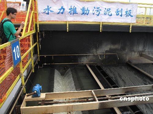 香港特区政府渠务署在迎来成立二十周年之际,于二零零九年三月二十一日向市民开放昂船洲污水处理厂,展示污水凈化处理过程,介绍和体验港府正斥巨资推行的净化海港计划。图为市民观看污水进入沉淀池后,水力推动的污泥刮板在水面上层刮起一层层黑臭污垢的过程。 中新社发 余瑞冬 摄