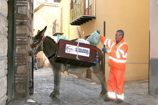 意大利一环卫工带着驴收垃圾 省钱又环保。在意大利的卡斯特尔博诺,一名环卫工人带着驴一起收垃圾。这座西西里岛南部的小镇近日用驴子取代卡车来运输居民的垃圾。镇长马里奥·西塞罗表示,驴子比卡车更环保,而且费用也更便宜。