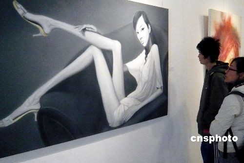 3月22日,位于北京朝阳区的798艺术区内中外游客络绎不绝。作为中国当代艺术文化展示园区,这里汇集了中国当代艺术家不同门类、派别、风格的多元化艺术作品,呈现出百家争鸣的繁荣景象。图为北京798艺术区绘画作品吸引游客。中新社发 钱兴强 摄
