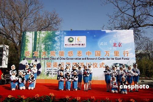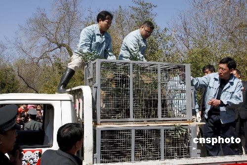 3月22日,在北京生活了9个月的8只奥运大熊猫开始起程返回四川老家,北京动物园特地举办了“奥运熊猫返川仪式”,吸引万名观众前来依依惜别。同时,也为“卧龙大熊猫感恩中国万里行活动”划上一个圆满的句号。中新社发 郑雄增 摄