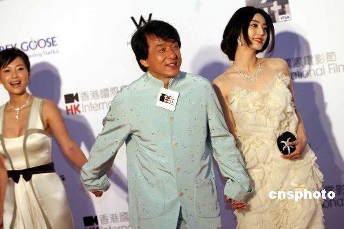 三月二十二日,巨星成龙携女星范冰冰、徐静蕾出席香港国际电影节开幕酒会。今届香港国际电影节出席的影视红星、嘉宾人数突破以往纪录,比去年多出百分之五十八,成为阵容最强大的一届。中新社发 洪少葵 摄