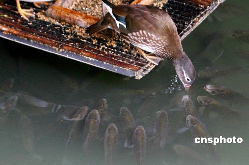 3月23日,苏州拙政园池塘内的鸳鸯给水中鱼儿“喂”食。自08年秋季苏州拙政园饲养在“卅六鸳鸯馆”景点池塘内上演了“鸳鸯喂鱼”后,曾一度被人们传为自然界动物亲情的美谈与佳话。时下,随着今年春来水暖,该池塘里的鸳鸯们又开始充当“爱心鱼妈妈”,并争相给成群结队浮出水面的小鱼儿“施舍”喂食,吸引了不少游客驻足观看。中新社发 王建中 摄