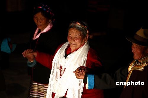 3月23日晚,西藏山南地区结巴乡结巴村的村民自发组织篝火晚会,喜迎西藏百万农奴解放日。结巴乡是西藏第一个“朗生互助组”的诞生地。西藏实行民主改革后,广大农奴获得了解放,自己当家做主,并拥有了土地。图为83岁高龄的次仁拉姆(左)表示:百万农奴解放纪念日是山南地区农民最吉祥和最幸福的一天。1959年西藏山南地区实行民主改革以后,结巴村被解放的农奴和朗生们自主地组织成立了第一个“朗生互助组”,而当年倡议成立互助组并任组长的就是次仁拉姆。中新社发 杜洋 摄