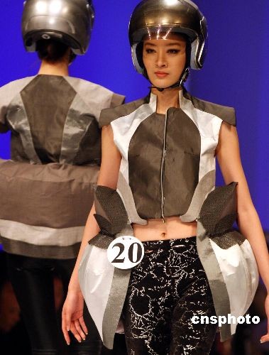3月24日,在北京开幕的中国国际时装周(09/10秋冬系列)展示系列活动上,举行了第17届中国国际青年设计师时装作品大赛决赛,来自18个国家的31位青年设计师和来自中国15个省市地区的24位设计师参加作品展示。图为模特展示颇具太空感的时装作品。中新社发 钱兴强 摄