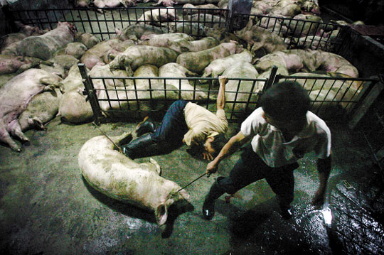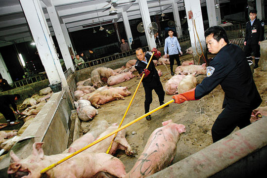 25日晚9时许,记者在现场看到,工作人员正对这149头生猪逐头进行电击。“现在我们先用电棒将这些生猪电死,然后再分批运往广州市卫生处理厂作无公害处理。”一名工作人员介绍。
