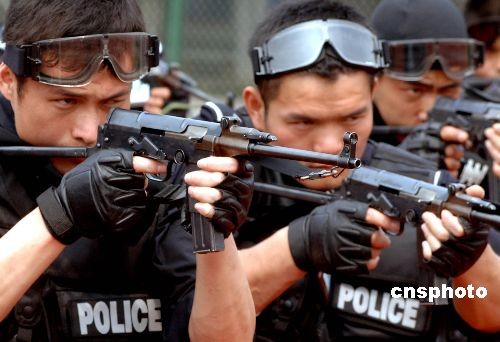 三月二十六日,三名持枪特警在福建警察学院战术系教官指导下进行模拟演练,处置突发事件。自三月二十三日开始,来自福州、厦门、漳州、泉州等福建各地的三十八名特警,在福建警察学院进行为期一个月的封闭式训练,旨在提高特警处置突发事件能力。中新社发 刘可耕 摄