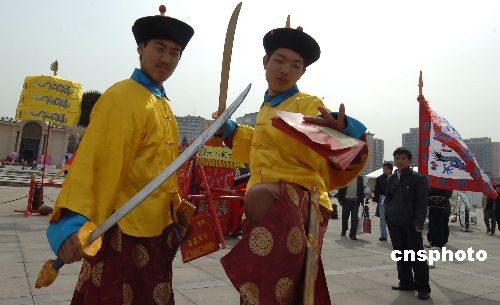3月27日,2009春季中国(北京)国际婚博会在在北京展览馆开幕。一家以中式婚礼为特色的婚庆公司人员,身穿黄马褂,手持“兵器”,向来宾展示古代宫廷文化和民俗婚礼礼仪。