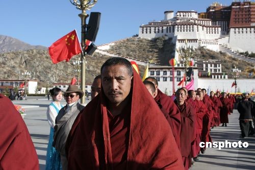 西藏百万农奴解放纪念日庆祝大会三月二十八日上午在拉萨市布达拉宫前广场举行,西藏各族各界代表出席。图为西藏寺庙僧人代表出席庆祝大会。中新社发 曾嘉 摄