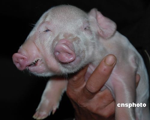 近日,浙江省嵊州市崇仁镇养猪专业户刘定生家一头饲养了4年的母猪产下八仔,其中一只小猪三眼两嘴双鼻,令人称奇。