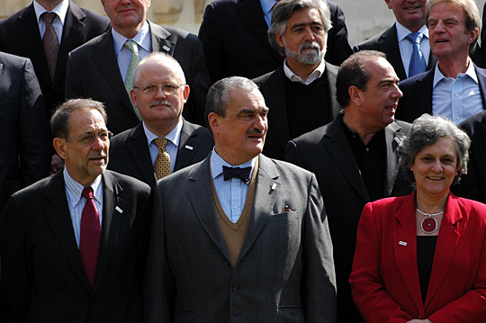 照“全家福”时站在欧盟理事会秘书长兼外交与安全政策高级代表索拉纳(前左)和欧盟轮值主席国捷克外交部长施瓦岑贝格(前中)右边的是61岁的匈牙利外长根茨。黄频 摄