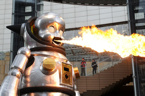 3月27日,日本著名美术家矢延宪司制作的高7.2米的巨型机器人“巨人Torayan”出现在东京街头,他不仅能载歌载舞,还能从嘴部喷射出巨大的火焰,令人们大为吃惊。