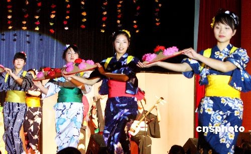 一群身着和服的日本姑娘在苏州农学院表演舞蹈。中新社发 王建中 摄
