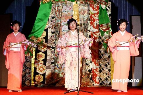 几名来自日本的姑娘穿着和服在苏州农学院演唱日本歌曲。中新社发 王建中 摄