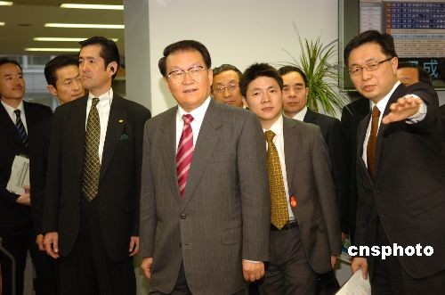 3月31日下午,正在日本进行友好访问的中共中央政治局常委李长春前往日本读卖新闻社参观访问。图为李长春在参观该社的采编中心。中新社发 朱沿华 摄