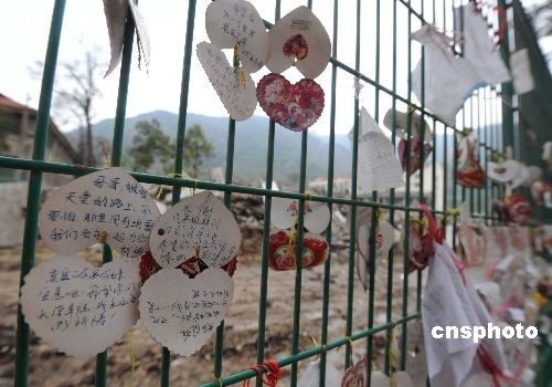 去年“5.12四川大地震”被摧毁的北川中学废墟保护区铁丝网上,许多连心卡写着肺腑感言,并系在一起,向遇难师生倾吐衷肠。中新社发 贾国荣 摄