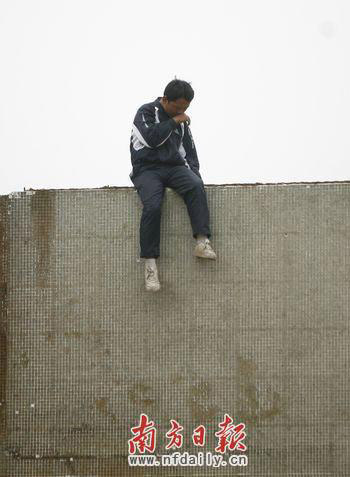 男子坐在楼顶,情绪一直很不稳定,不愿与任何人作交谈,期间还不断哭泣。三点二十分,这次哭泣时他用手去擦拭眼泪。张由琼 摄