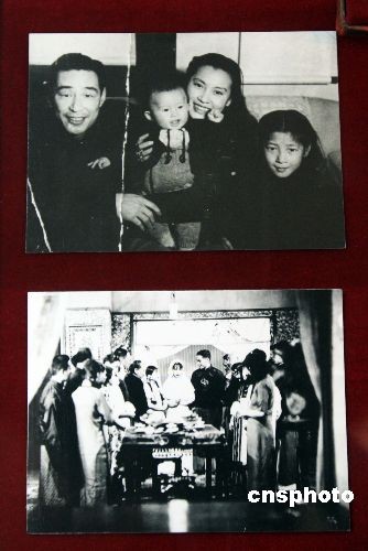 4月2日,上海福寿园“祭先烈、敬先贤、忆先人”清明月纪念展开幕,百余位建国英雄、名人精英、艺术大师的生平资料和实物史料亮相。图为上世纪三十年代“电影皇帝”金焰与著名电影艺术家秦怡的结婚场景照(下图)以及他们夫妇与孩子的合影(上图)首次公开展览。金焰,1910年出生于韩国汉城,代表作品《风流剑客》、《野草闲花》、《一剪梅》等。1948年金焰与秦怡结婚。1983年金焰离开人世。 中新社发 潘索菲 摄