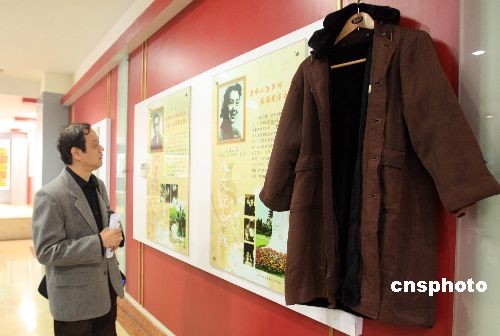 4月2日,上海福寿园“祭先烈、敬先贤、忆先人”清明月纪念展开幕,百余位建国英雄、名人精英、艺术大师的生平资料和实物史料亮相,图为展示中的著名电影表演艺术家上官云珠的海芙蓉大衣。上官云珠在1952年中国第一届优秀电影评比中,以《乌鸦与麻雀》一片获金质奖,受到毛主席、周总理亲切接见。