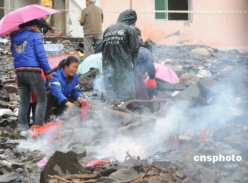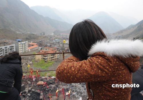 清明节前夕,在“5.12大地震”遭毁城的四川北川县连日开放封闭保护的废墟,让民众祭奠遇难亲人。大地震后的老县城遗址变成幸存民众的“哭城”。中新社发 贾国荣 摄