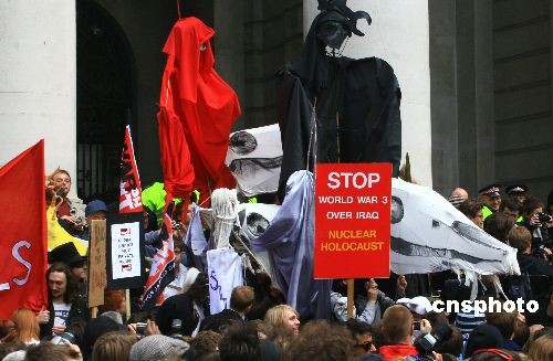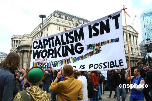 图为示威者高举着旗帜,宣称“资本主义不灵了”。中新社发 李鹏 摄