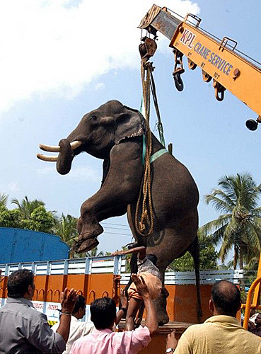 图:印度大象遇车祸骨折 兽医用起重机搬运(2)