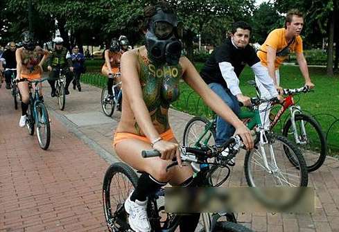 4月1日,在哥伦比亚首都波哥大街头,一群裸身的女志愿者头戴防毒面具、骑着自行车,呼吁市民多采用骑自行车的出行方式,以减少对汽车的依赖,从而降低有害气体的排放量。