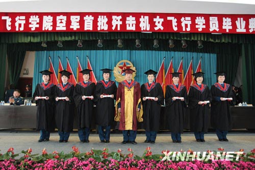 4月2日,空军第三飞行学院领导为首批战斗机女飞行员颁发学位证书并合影留念。(谭超摄)