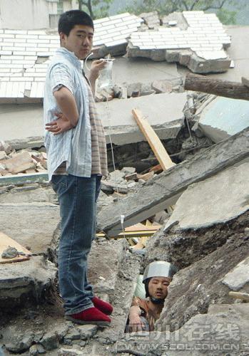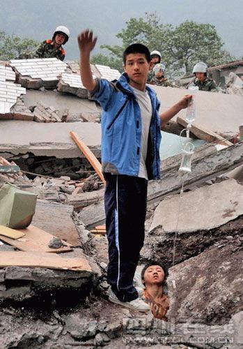 2008年5月13日上午9时许,早报摄影记者在北川中学废墟旁,拍到一张照片。照片上,“夹缝男孩”廖波仍在夹缝里,举着点滴瓶的人,却不是李阳。海洋看过那张照片后,我们才知道,“吊瓶兄弟”不止一个。