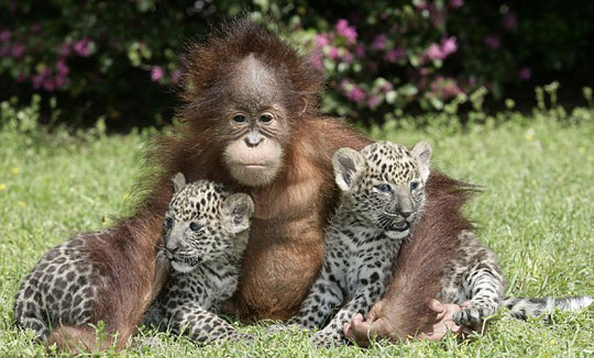 据英国媒体报道,在美国南加州的一个濒危动物保护中心里,2头5周大的小非洲猎豹与一只1岁大的小猩猩成了亲密的好朋友。据称,这两只小猎豹长大后要供游客参观,不会放回到野生环境里。也许他们跟猩猩做个朋友也是个不错的选择。