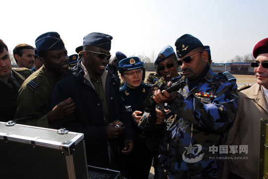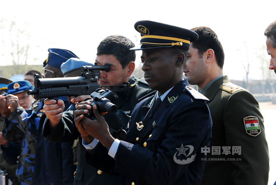 近日,在读空军指挥学院的36个友好国家的115名外籍留学学员,来到武警8643部队参观见学。武警官兵以高昂的士气、扎实的作风、过硬的素质为外籍留学学员进行了现场处突课目演示和静态装备展示,让他们近距离接触和了解中国武警部队的训练、工作和生活情况。这次参观见学是空军指挥学院外训系的一项教学观摩活动,更是总参、总部为加深了解、促进交流、增进友谊安排的一项重要外事活动。在深入班排,参观了官兵基础生活、娱乐设施后,外籍留学学员纷纷表示,中国武警威武的形象和一流的工作标准给他们留下了深刻的印象。 (吕甫琴、朱尚军 摄影)