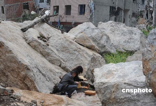 一对夫妻清明回到“5.12大地震”遭毁城的四川北川县,在山体崩塌的巨石间,朝被掩埋的家园和遇难亲人烧香祭奠。中新社发 贾国荣 摄