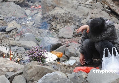一位母亲采来山野鲜花,清明回到“5.12大地震”遭毁城的四川北川县,在废墟上祭奠遇难的亲人孩子。中新社发 贾国荣 摄