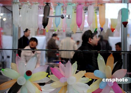 4月4日,首届北京计划生育用品展在北京举办,避孕套展台色彩缤纷。中新社发 廖攀 摄