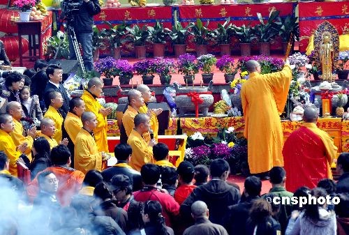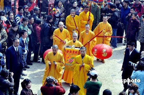 4月4日,为了祭奠早年闯关东讨生计的先人,沈阳棋盘山影视城举办首届“闯关东列祖祭祀大典暨清明祭祖大典”,仪式开始首先鸣放百家礼炮告慰百家先祖,然后有高僧入场诵经,敬手上香,然后来宾向百祭坛供奉列祖列宗行三拜之礼。中新社发 文契 摄