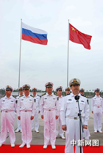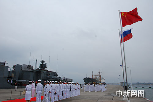 海军南海舰队副参谋长邢玉启少将在码头上主持仪式,迎接俄军舰到访。华小平大校等海军官兵出席了欢迎仪式。中俄海军双方还在码头接受了媒体共同采访。
