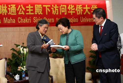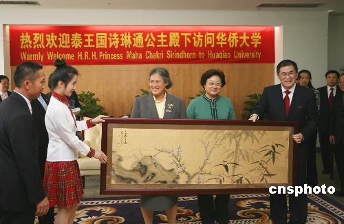 国务院侨办主任李海峰(中)、华侨大学校长丘进(右)向诗琳通公主(左)赠送纪念品。中新社发 傅丹丹 摄