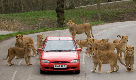 据英国媒体报道,游客驾驶着汽车在英国一家野生动物园观光时被10多头狮子围困,司机把车门和窗户紧紧关闭,以防动物袭击。此时,司机的表情还能否如观光时一样愉悦就不好说了。