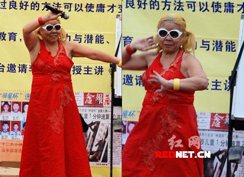 图:老年版非主流亮相街头 金丝发大红裙(2)