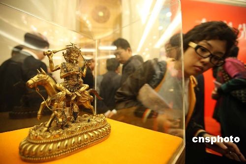 4月8日,由著名民间收藏家李巍收藏的22尊明清珍品佛造像正式捐赠中国国家博物馆,其中,明初宫廷官造“大明永乐年施”铜鎏金吉祥天母像是目前仅存世两件作品之一,堪称存世精品。另外两件“大明永乐年施”铜鎏金无量寿佛像、明代铜鎏金橛金刚像为代表的这批铜佛造像均具有很高的工艺水准和艺术风格,不乏文物艺术价值极高的罕见之作。中新社发 富田 摄