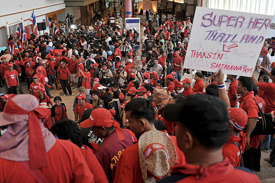4月11日,泰国至少1000名反政府示威者闯入召开东亚领导人系列会议的一个会议中心。“红衫军”抗议者高喊要求总理阿披实下台的口号,他们冲破了警察封锁,打碎玻璃门,涌入了会议中心。